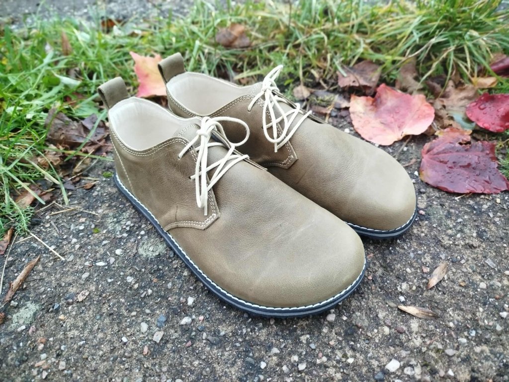 Barefootové polobotky HAPPY FEET jsme ušili z pěkné khaki  kůže. Nízké, šněrovací boty jsou navrženy a ušity tak, aby v nich noha mohla pracovat co nejpřirozeněji. Mají prostornou špičku, která zabraňuje stlačování a deformování prstů. Podrážka je tenká (3+1mm vzorek), ohebná příčně i podélně. Díky tomu se stává každý krok přirozenou léčivou  masáží reflexních bodů chodidel. Podšívka je ze světlé jemnější kůže, stélka je ušita z třísločiněnné kůže, která má dobré izolační vlastnosti. Polobotky jsou lehoučké, vhodné do měst i do terénu, určené k nošení od jara do podzimu.
