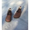 Severky... jsou barefootové botky, určené do terénu a do města, vhodné na zimu. Zatepleny jsou 100% VLNOU. Jsou to pohodlné, měkké, teploučké kotníkové boty, ušité polovoskované kůže v barvě oříškově hnědé. Mají tenkou, ohebnou podrážku (3mm+1mm vzorek),  a MEZIVRSTVU (2mm)- měkký, pružný materiál, jeho smyslem je tepelná izolace a mírné odpružení, zmírnění tvrdého došlapu v městském terénu. Přes tento typ podrážky není terén cítit. Součástí bot jsou vyjmutelné VLNĚNÉ VLOŽKY.