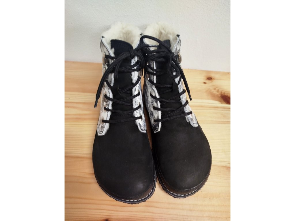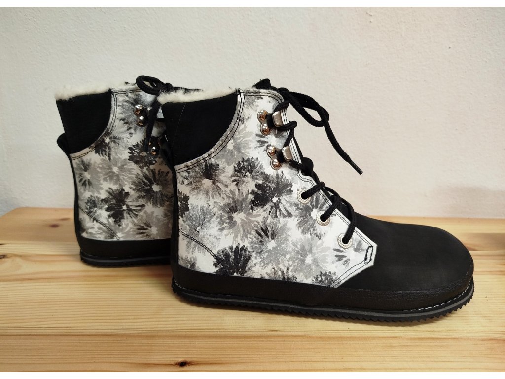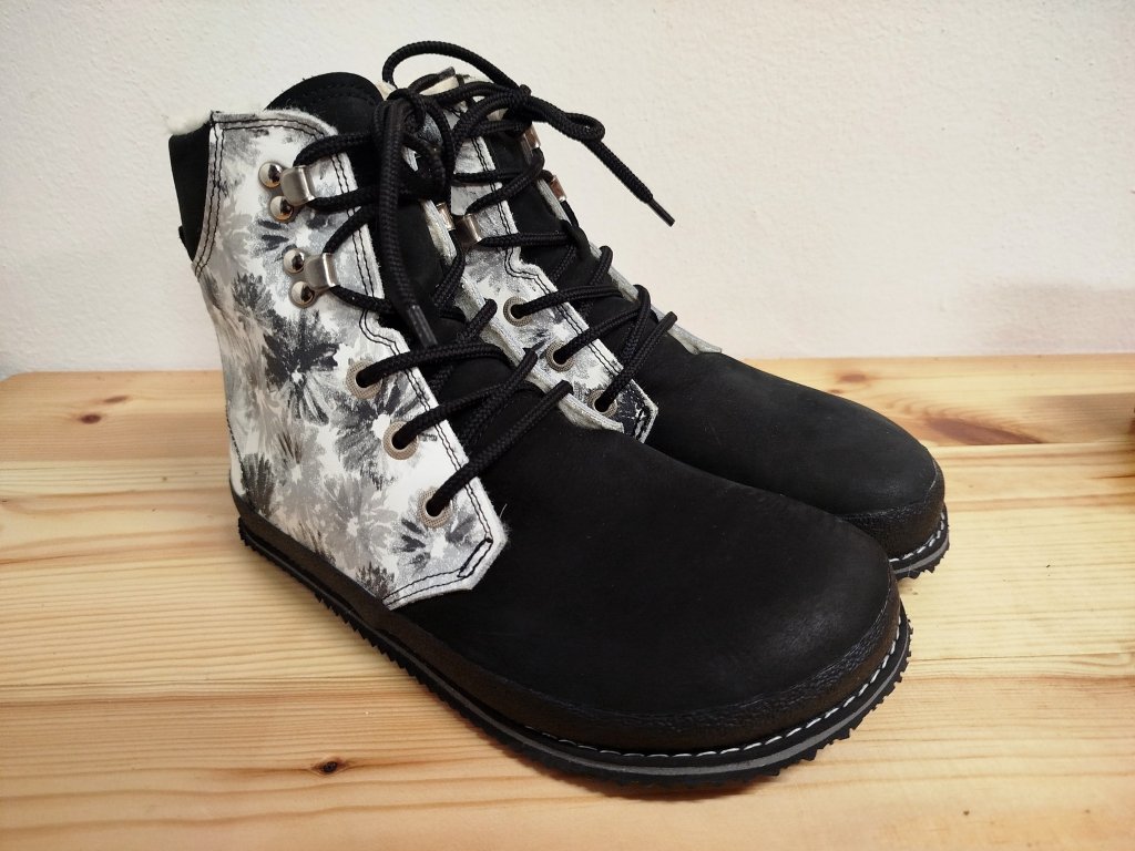 BLACK AND WHITE....černá hladká kůže  barvy v kombinaci s černobílou kůží s květinovým potiskem. 100% vlna a ševcovské řemeslo.... teploučké a pohodlné barefoot.